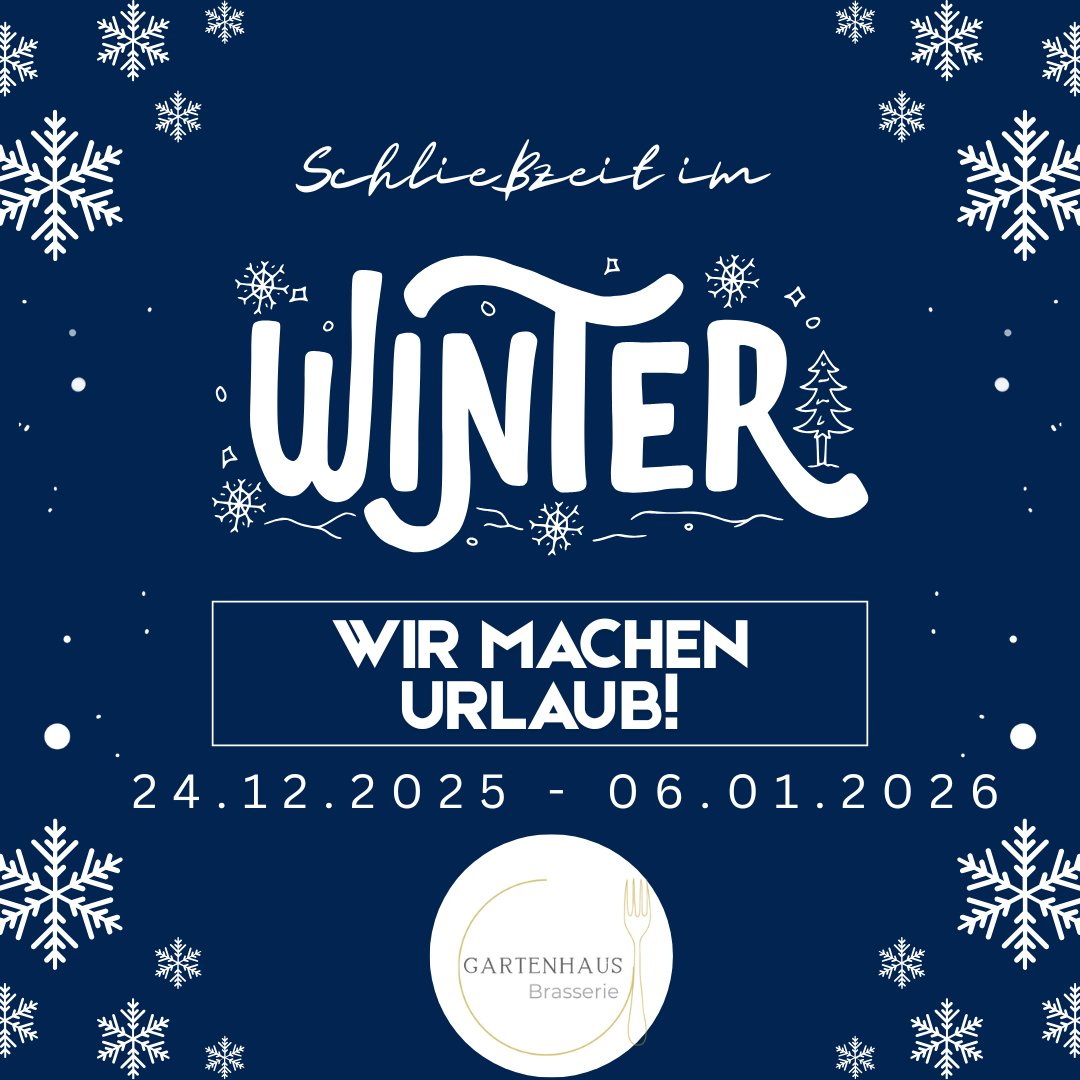 Liebe Gäste,auch wir gönnen uns eine kleine Auszeit:Vom 24. Dezember 2025 bis einschließlich 6. Januar 2026 bleibt das Gartenhaus geschlossen.